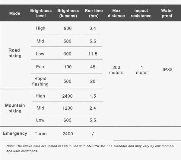 Display the remaining runtime of each brightness level instantly in an intuitive way and helps to select the ideal brightness level for different riding situations