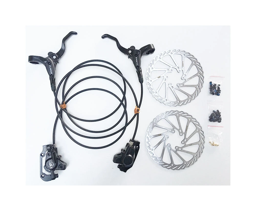 Contents:Front & rear calipers with levers, hoses and fittings, 2 rotors and 2 sets of bolts
