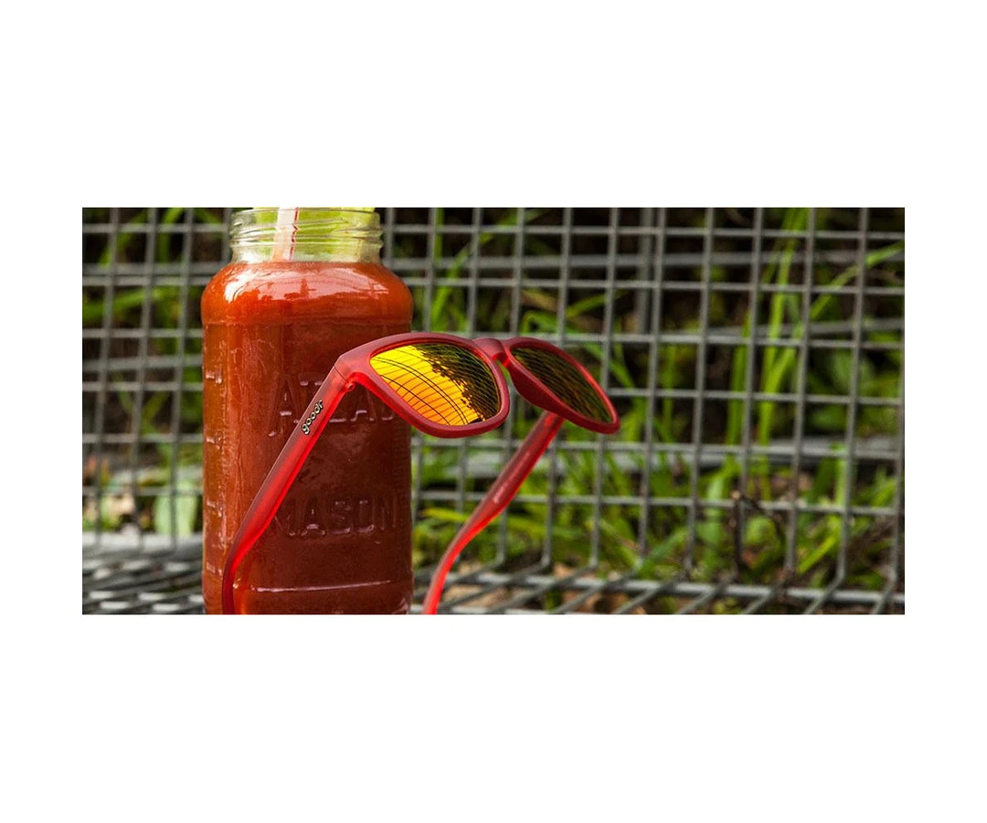 Next time you black-in while inside a bathtub in Las Vegas, rise from the ashes of your dumpster fire of a life with these red frames with rose lenses and a little hair of the dog. We prefer a thick and salty Bloody Mary.