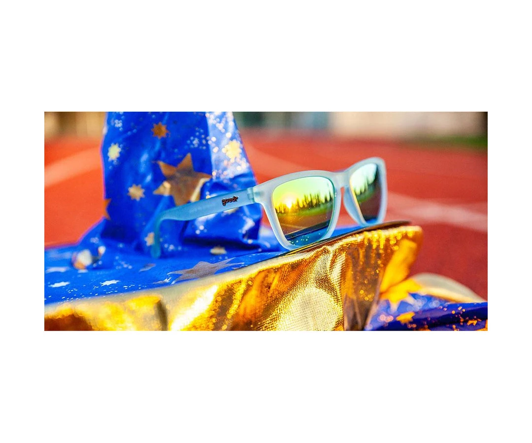While it might be the magic that gets them all the love, we prefer to celebrate wizards for their panache: capes, pointy hats, and, beards. But just wait until you see one on their beach run rocking these fresh blue shades with gold lenses. Abracadabra, Muggles.