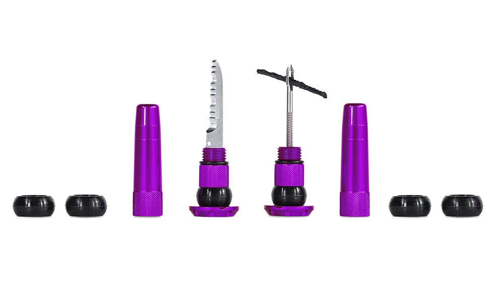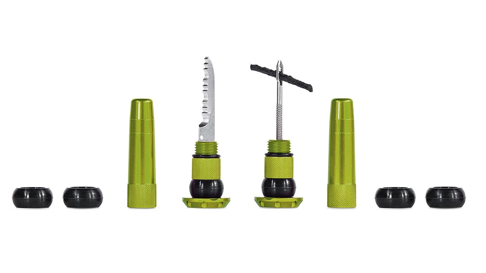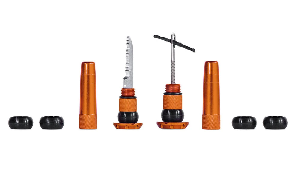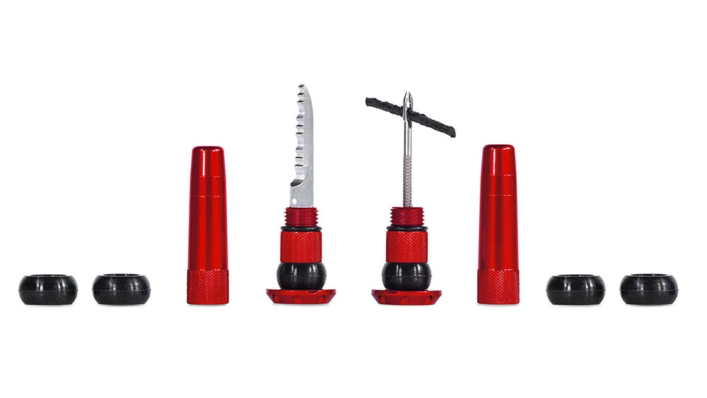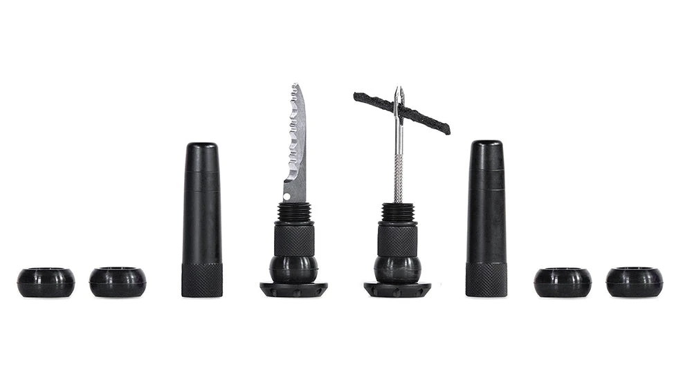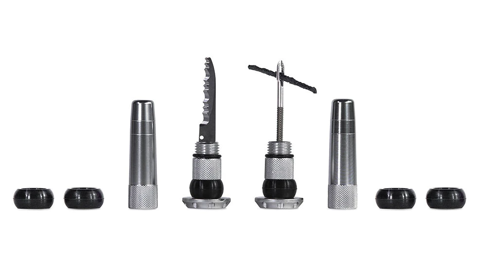 Each light weight and durable set contains everything you need to get back riding when you’re stuck battling a hole that’s just not sealing: a stanless steel 2-in-1 puncture plug reamer tool, a variety of different sized tyre worms and a trimming knife.