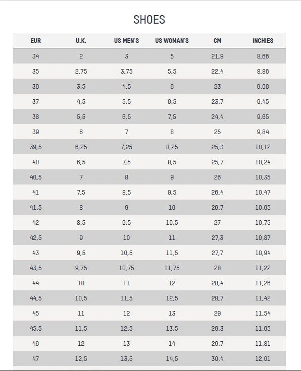 | Size | UK 6 / EU 39, UK 6.5 / EU 40, UK 7.5 / EU 41, UK 8.5 / EU 42, UK 9.5 / EU 43, UK 10 / EU 44, UK 11 / EU 45, UK 12 / EU 46, UK 12.5 / EU 47, UK 13 / EU 48 |