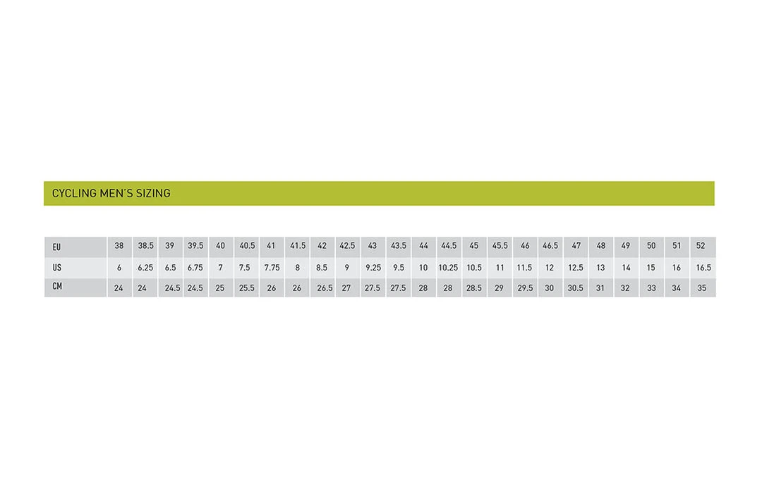 | Size | UK 6 / EU 40, UK 7 / EU 41, UK 7.5 / EU 42, UK 11.5 / EU 47, UK 12 / EU 48, UK 10.5 / EU 46 |