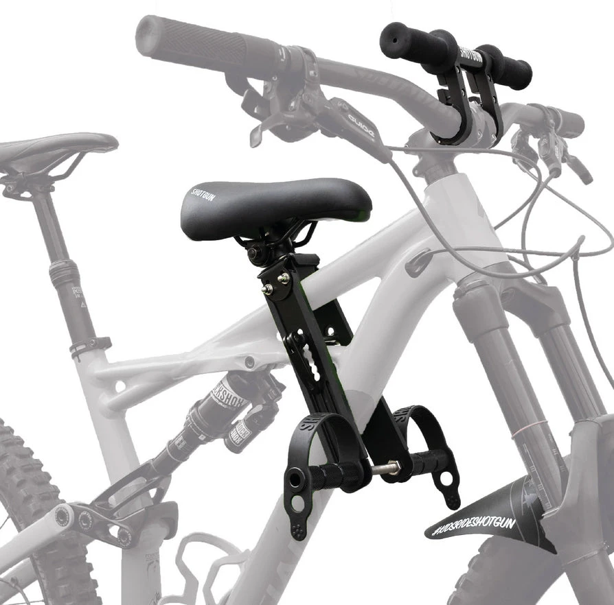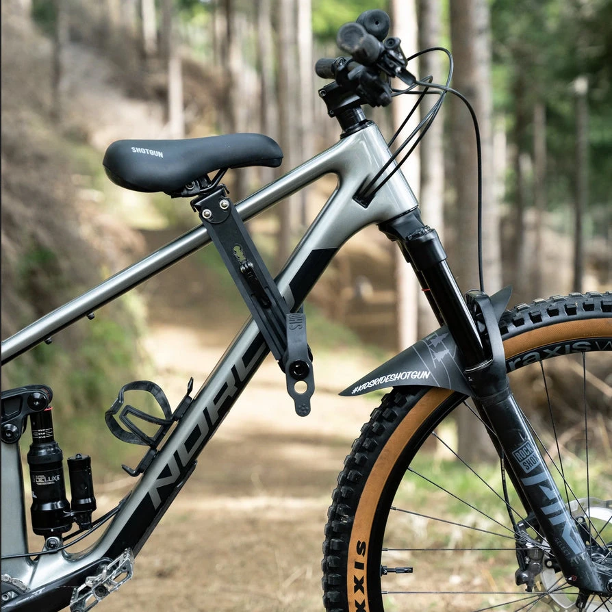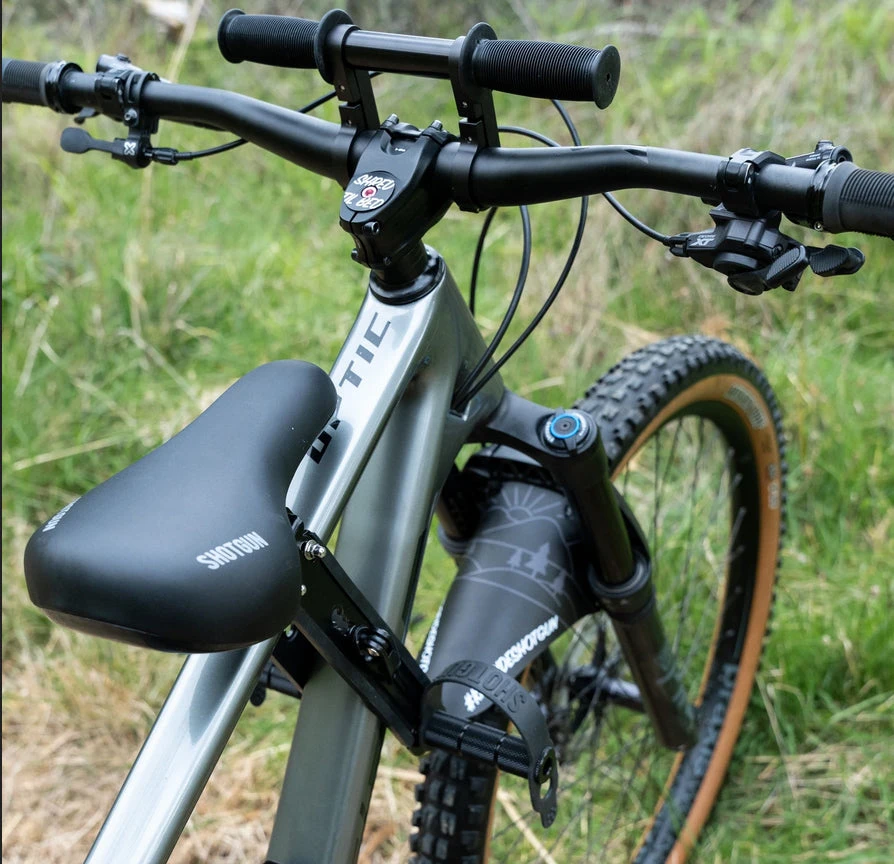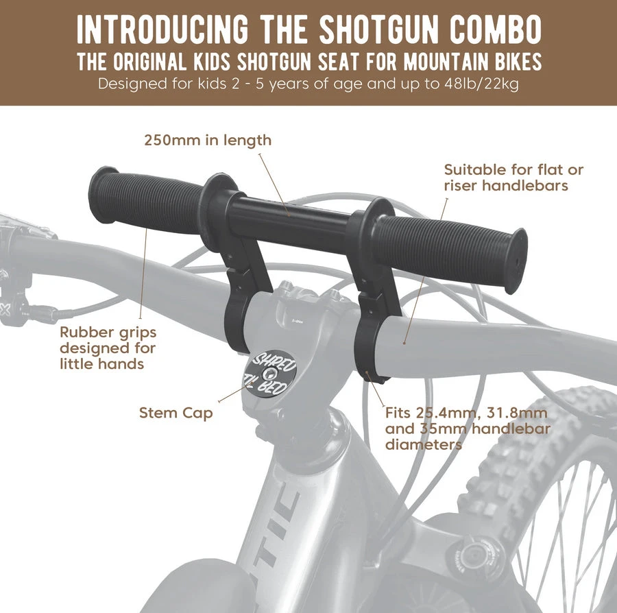 The shotgun combo is the ultimate setup for your mountain bike kid. Not only will you get the shotgun seat and handlebar accessory, you’ll also get our custom mudguard and one of a kind ‘shred til bed’ stem-cap too.