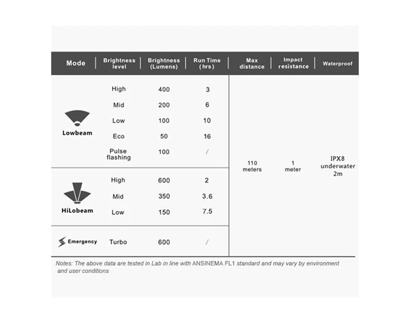 LED: 2 CREE XP-G2 with a lifespan of 50000 hours