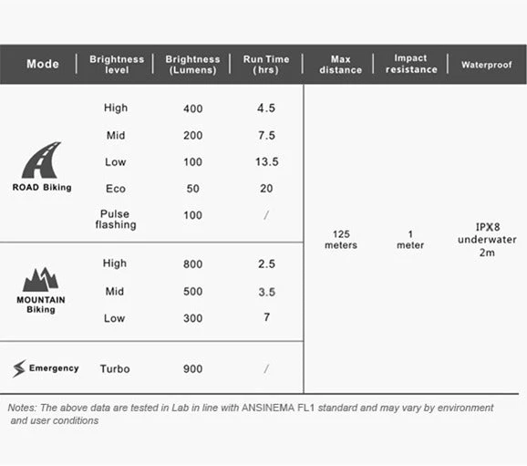 Max 900 lumens, 3 modes and 8 brightness levels for various riding environments